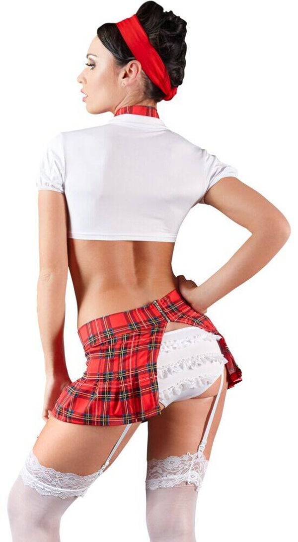 Kurze Bluse zum Knoten, Falten-Minirock mit aufregendem Po-Ausschnitt, woraus der Rüschenslip mit angenähten, verstellbaren Strapsen hervorblitzt. Hinten Reißverschluss. Passend dazu eine strenge Krawatte und Strümpfe.