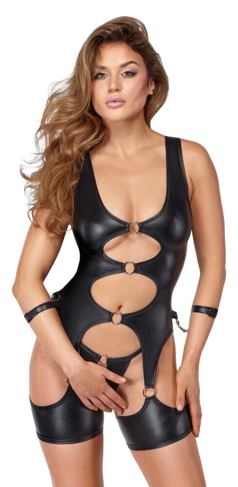 Aufregendes Set von Cottelli BONDAGE mit Strapshemd, String ouvert und soften Handfesseln. Stilvoller schwarzer Mattlook mit vielen silberfarbenen Ringen als Verbindungen und für Fesselspiele. Rundum elastisch und weich anschmiegsam für hohen Tragekomfort. Betonendes Strapshemd mit zeigefreudiger Front und breiten Schenkelbändern an den Strapsen. In der Taille zusätzlich jeweils seitlich ein Ring zum Einhaken der beiliegenden Handfesseln mit ihren Karabinerketten. Die soften Fesselriemen sind mit ihren Klettverschlüssen schnell angelegt und passend verstellbar. Der schrittoffene Mattlook-String komplettiert den fantasienanregenden Look.