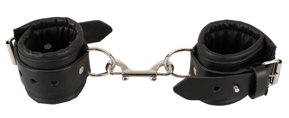 Stabile Leder-Handfessel von ZADO inklusive 2 Schlösser mit Schlüsseln. Leder-Fesselmanschetten hochwertig gearbeitet mit abgesteppten Kanten. Dazu dick und weich gepolstert für hohen Tragekomfort. Jeweils mit Schnallenverschluss passend verstellbar und mit beiliegenden Schlössern arretierbar. Der starke Doppelkarabiner ist als Verbindung in die robusten Ringe der Manschetten schnell eingehakt.