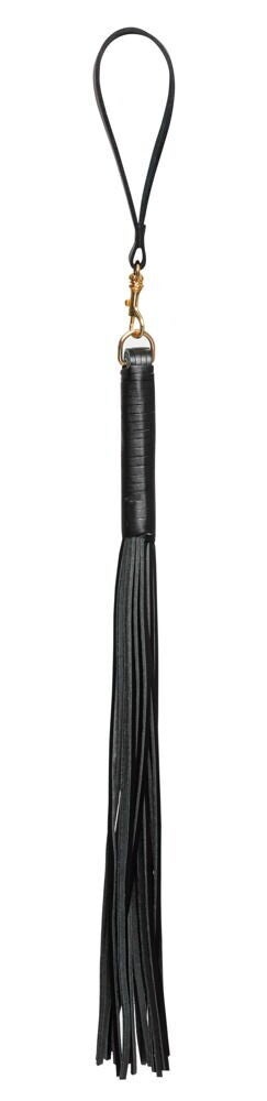 Handlicher Leder-Flogger von ZADO mit umwickeltem Griff und vielen weichen Lederriemen. Die Handschlaufe ist mit ihrem goldfarbenen Karabiner vom Griffring abnehmbar.