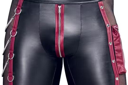 Enge betonende Pants von NEK mit unterlegtem Reißverschluss im Beutel. Im coolen schwarzen Mattlook mit roten Kontraststreifen und silberfarbenen Details. Weich, elastisch und mit bezogenem Bundgummi für maximalen Tragekomfort. Jeweils seitlich Netz-Einsatz. Auf der einen Seite zusätzlich mit Ringen und 3 abnehmbaren Karabiner-Ketten, auf der anderen Seite Nieten und eine aufgesetzte Cargotasche mit Reißverschluss.