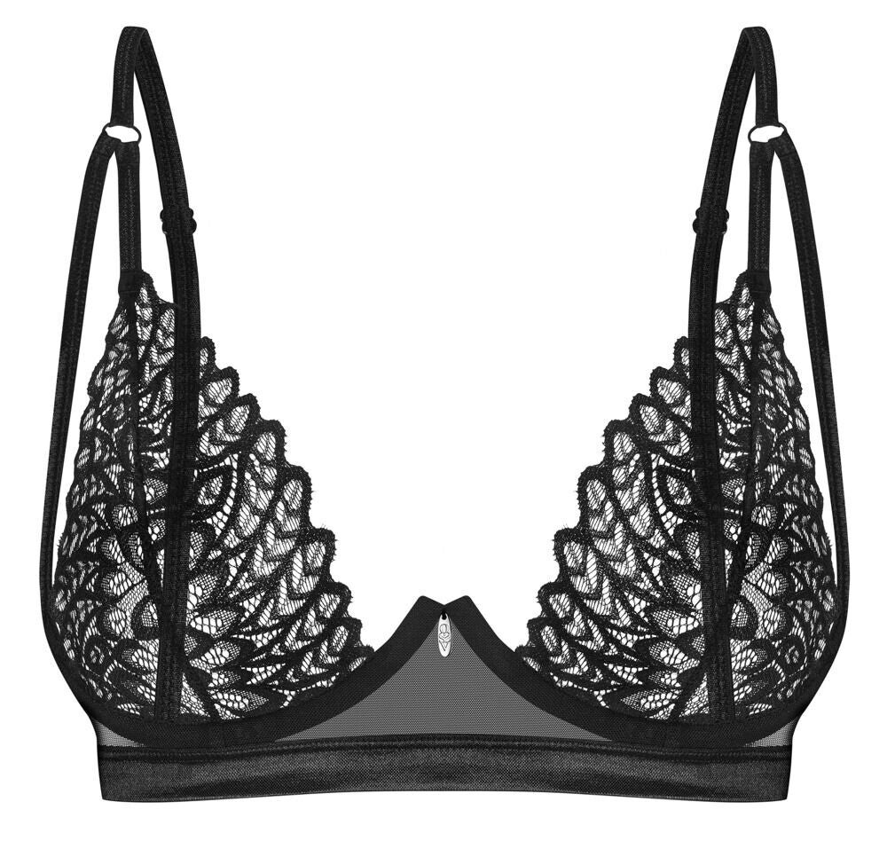 Schwarzer Bügel-BH Donarella von Obsessive aus feinem besticktem Stretchtüll. Die weichen elastischen Cups schmiegen sich komfortabel formend an. Als Eyecatcher ein kleines Schmuckelement zwischen den Cups. Der Hakenverschluss im Rücken und die Träger sind passend verstellbar.